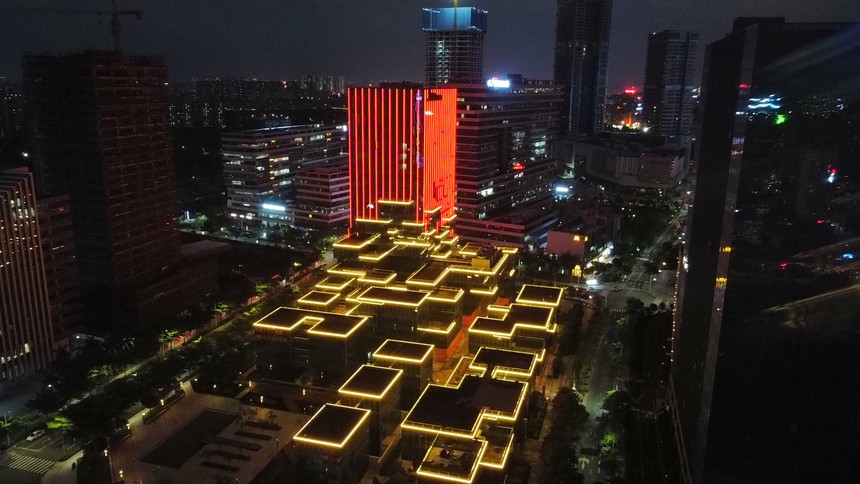 1、外牆炫彩燈光,使用DMX512點光源、線條燈、網格屏等產品實現